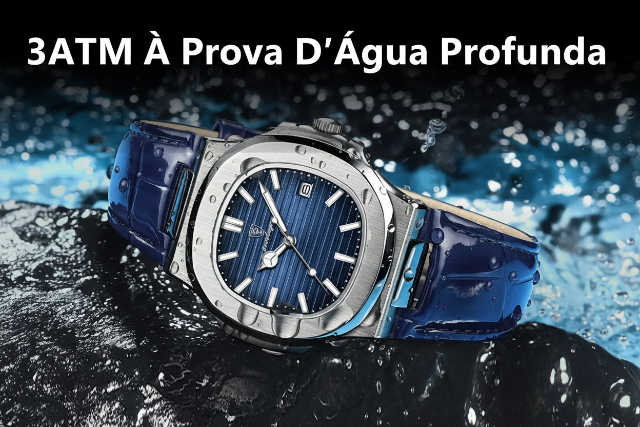 - Pulseira em Couro Premium: O acabamento em couro com textura de crocodilo na cor azul profunda garante um ajuste confortável e um visual extremamente elegante.