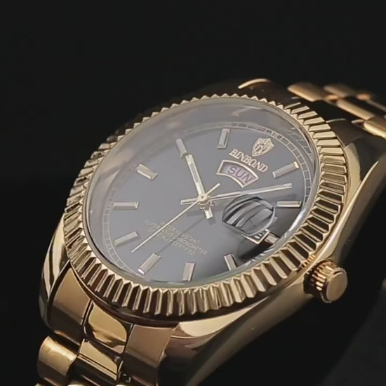 - Calendário Duplo Funcional: Equipado com exibição completa do dia da semana em arco e janela de data com lente de aumento, unindo a precisão do tempo à conveniência executiva.