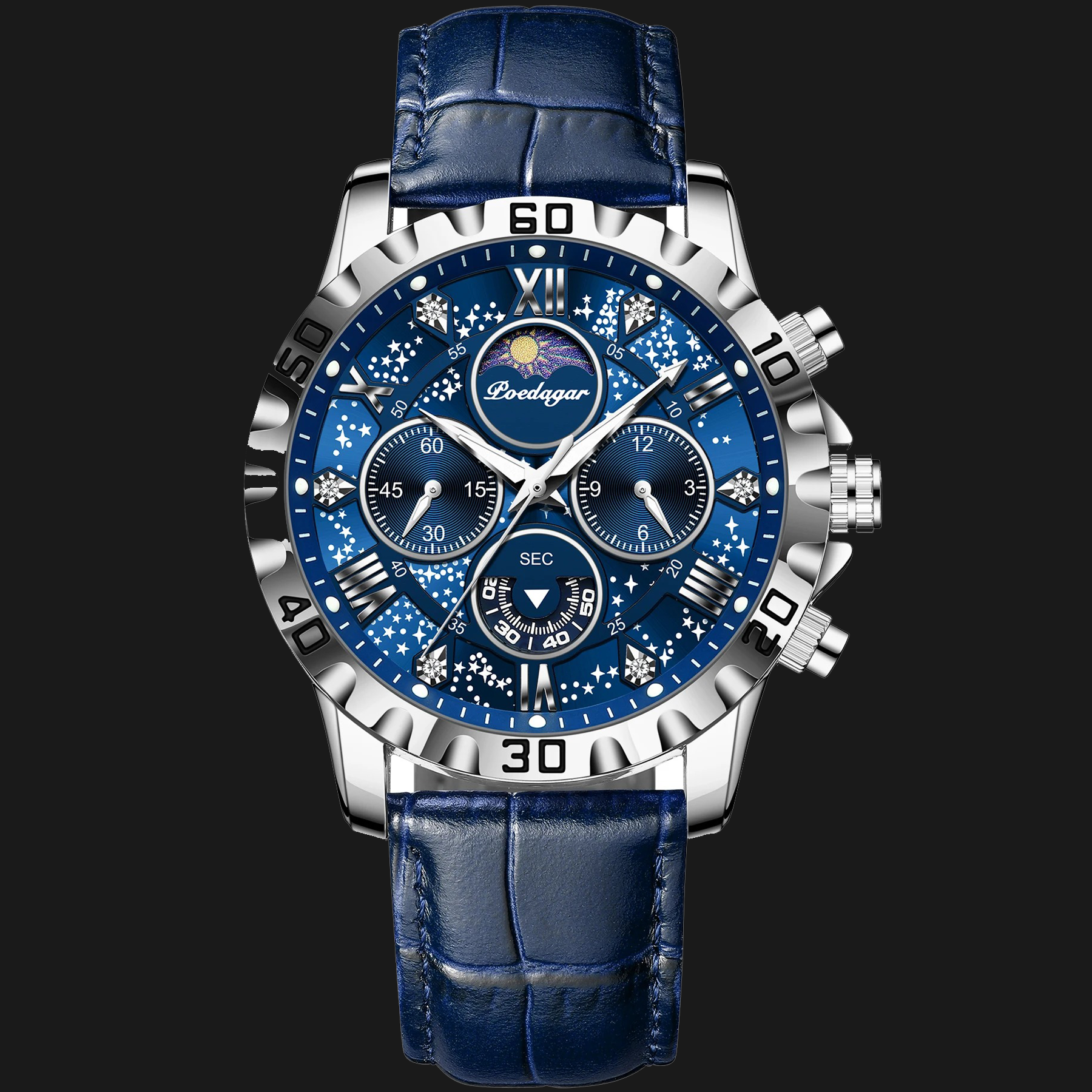 - Design de Mostrador Galáctico: O fundo azul profundo é decorado com padrões que simulam estrelas, oferecendo uma estética mística e sofisticada que se destaca em qualquer ocasião.