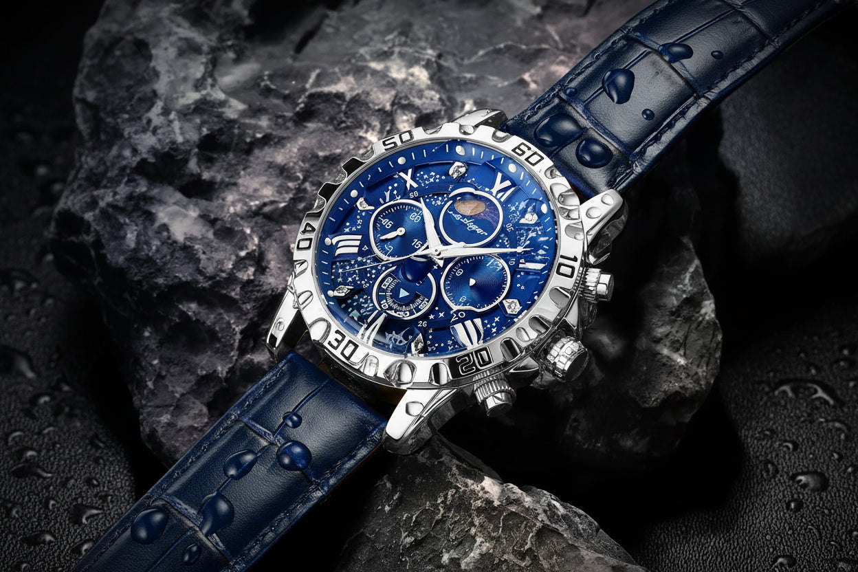 O Orion é uma peça de impacto para o homem que busca um design poético e uma presença magnética. Com um mostrador que evoca um céu estrelado, complementado por um indicador de fases da lua e um bezel robusto e trabalhado, este relógio é a definição de luxo artístico. É o acessório perfeito para quem busca um visual de altíssimo valor percebido com a sofisticação acessível da Lubec.