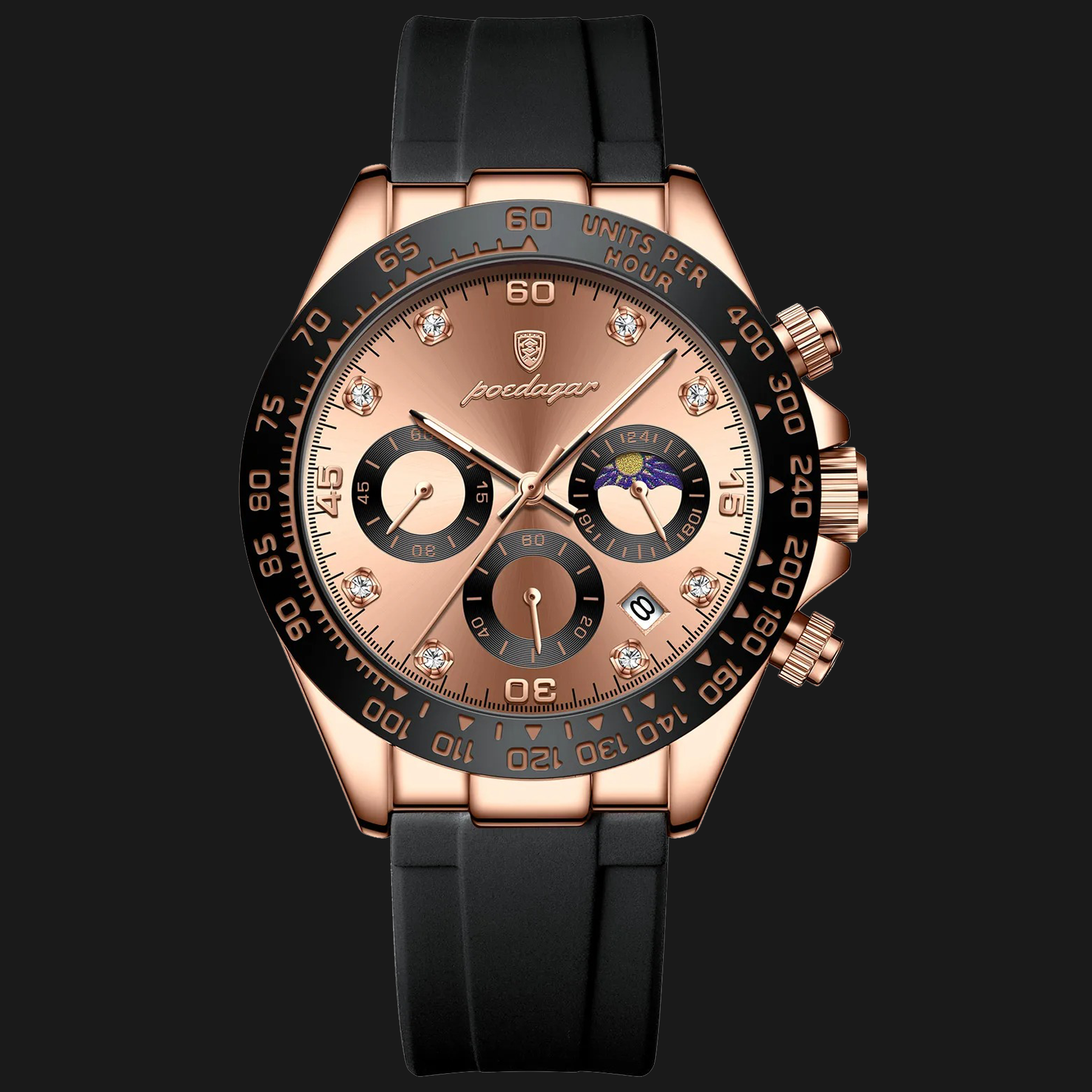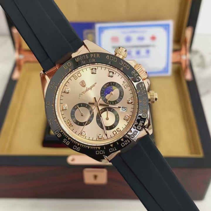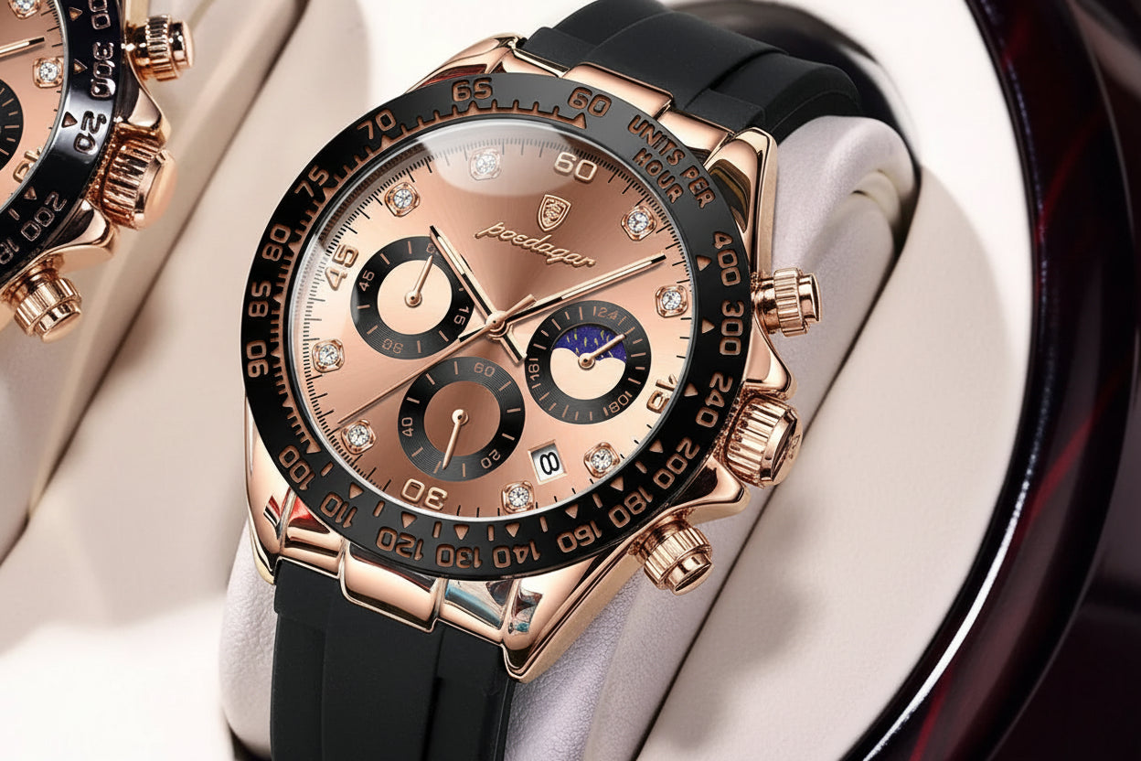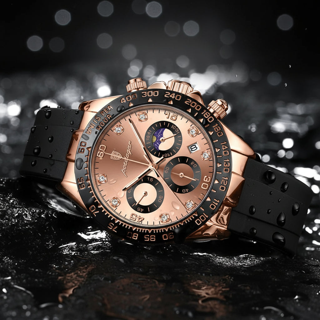- Design de Alto Impacto: Apresenta uma caixa robusta em Rose Gold com acabamento polido e um bezel taquimétrico preto que garante autoridade e presença imediata no pulso.