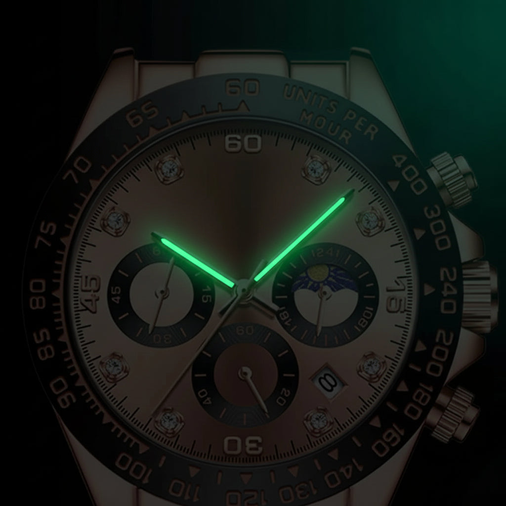 - Funções: Cronógrafo funcional, Calendário Automático e Fases da Lua.